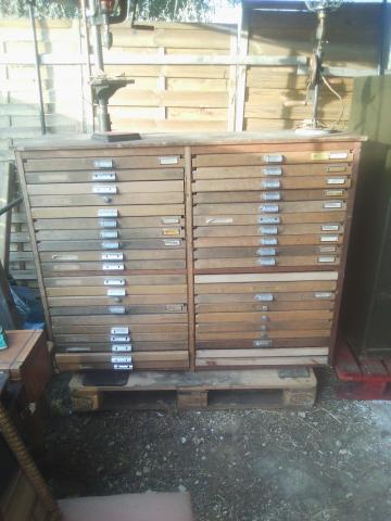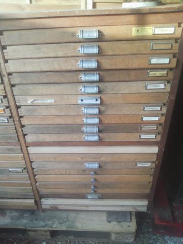 vends grand meuble d'imprimerie il possède 40 tiroirs il mesure 143 cm de long 48 de largeur 112 de haut et 46 de profondeur les tiroirs mesures 65X 44 le meuble est dans sont jus