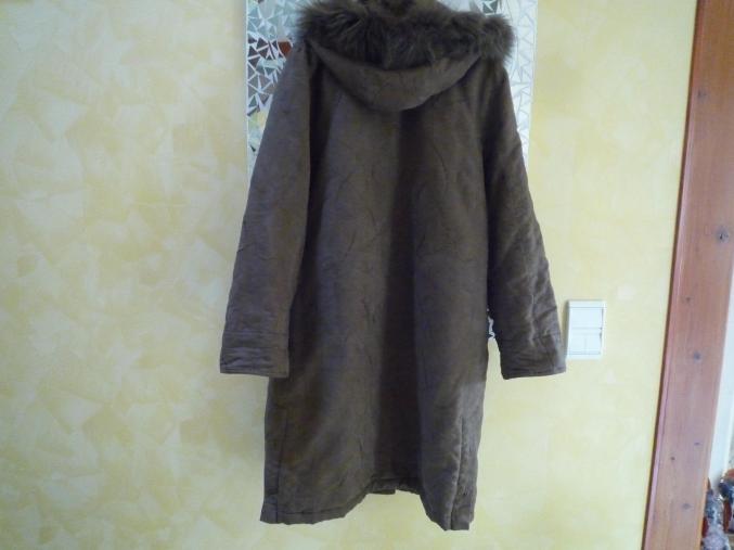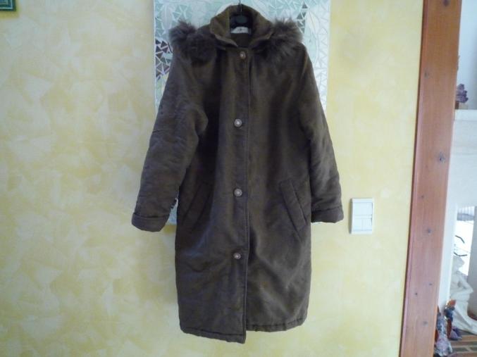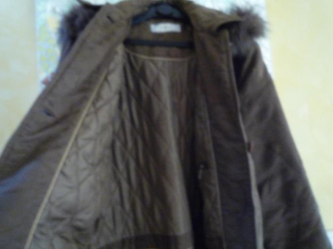 Manteau très confortable "C. Missaro" en parfait état, couleur kaki. Taille : 42, 100 % polyester. Il possède une poche intérieure et une capuche fausse fourrure.