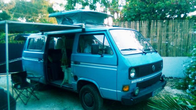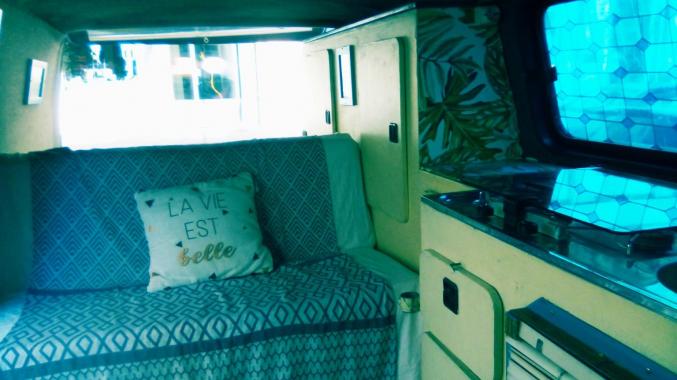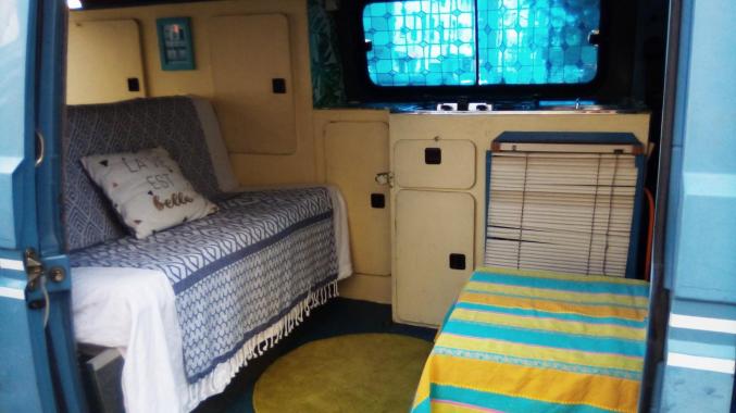 Combi de 1989, type camping car, cuisine, système d'eau, petite toilette, frigo, banquette arrière convertible en lit deux places, moteur neuf, contrôle pollution ok, carrosserie à revoir.